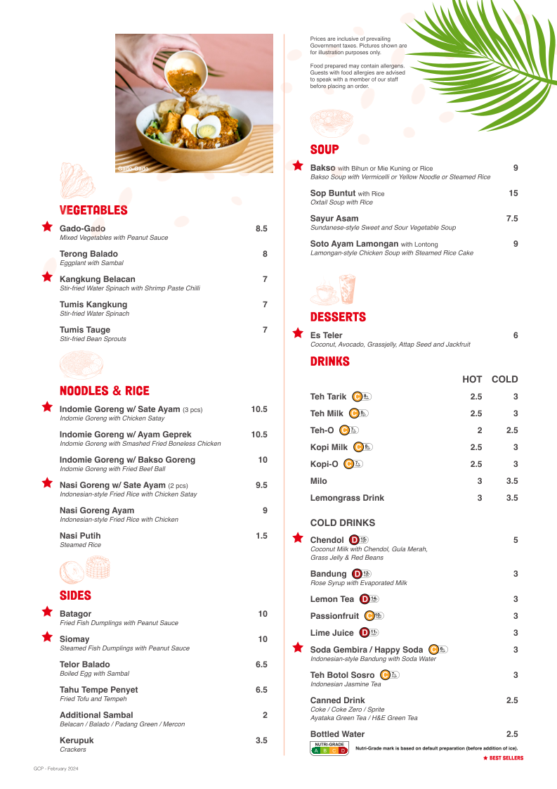 In terms of drinks, the menu offers a selection to refresh your palate. You can opt for a fizzy Sprite, a soothing Lemon Tea, the vibrant BandungAyataka Green Tea, or a simple Bottled Water to accompany your meal.